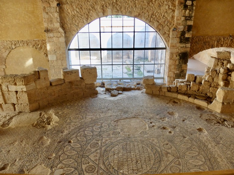 The next stop on our walking tour was quite quick: The Apstel’s Church (or Church of the Apostles). This one also featured an empty ticket office, but a woman inside waved us in. The structure was just one room, but the mosaic is dedicated to the Twelve Apostles, was created in 568 AD, contains the name of the craftsman – Salomios – and takes up the entire floor.