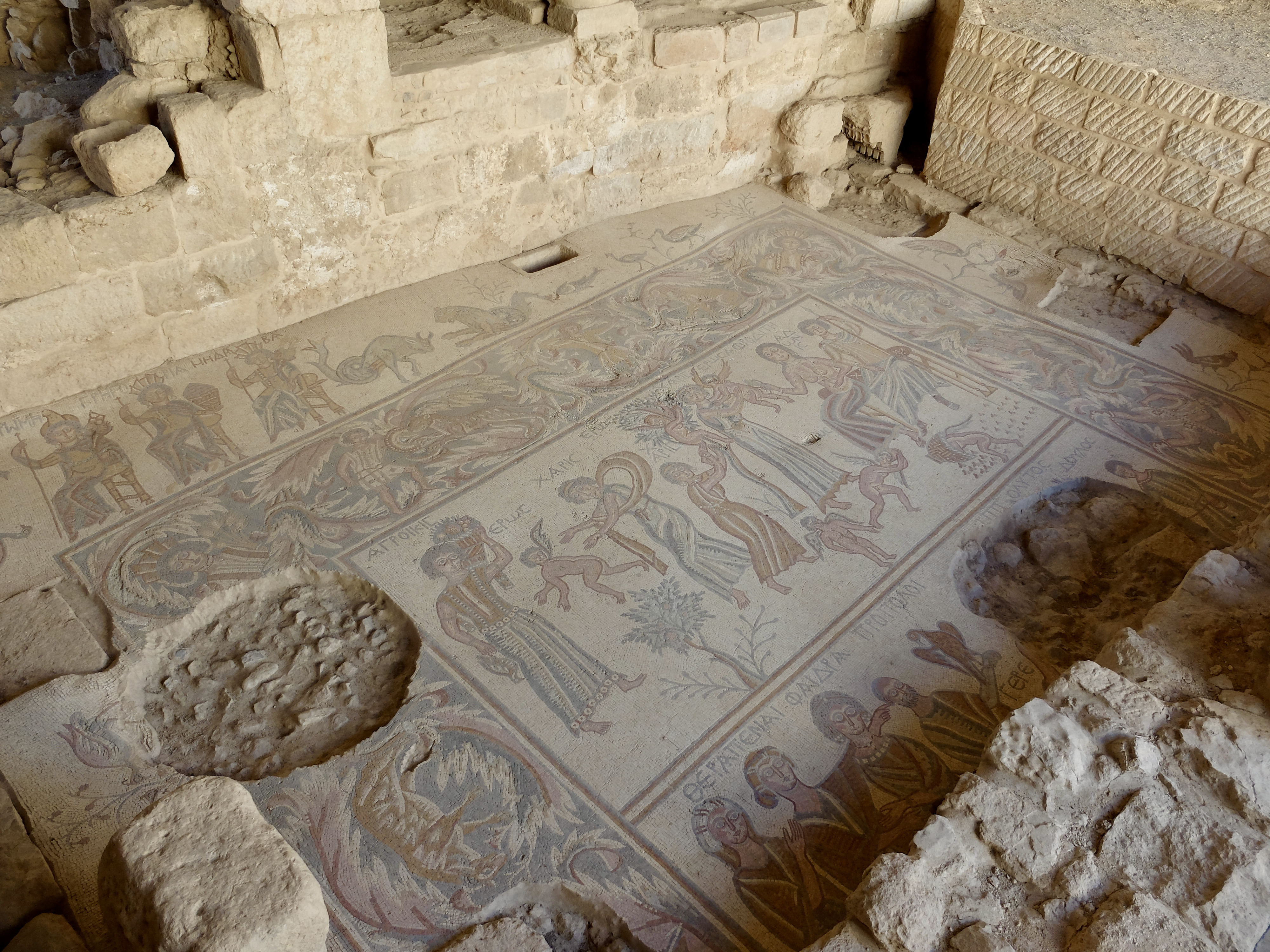 As the church was uncovered and explored, it was discovered that the church was actually built above the hall of an earlier Madaba mansion, known as the Hippolytus Hall. And, because Jordan is a country of layers within layers, the 6th century mansion was actually built on a circular Roman temple. You can see mosaics from each in the photos below.