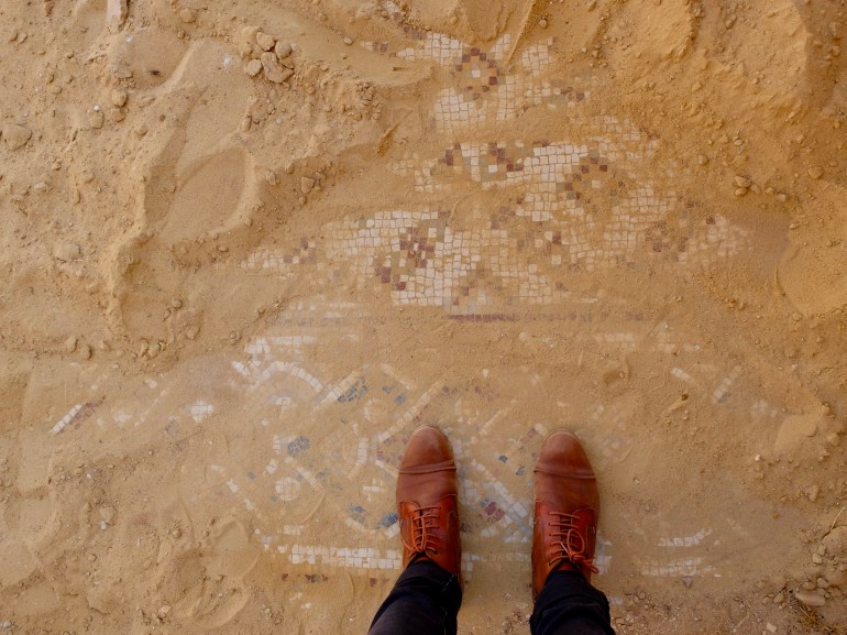 We wandered farther into the ruins, looking for Lion’s Church. Supposedly known for its colorful mosaics, when we finally found it, it was open to the elements and covered in sand. We thought we had found the wrong place and then I smudged my foot. The mosaics were underneath!