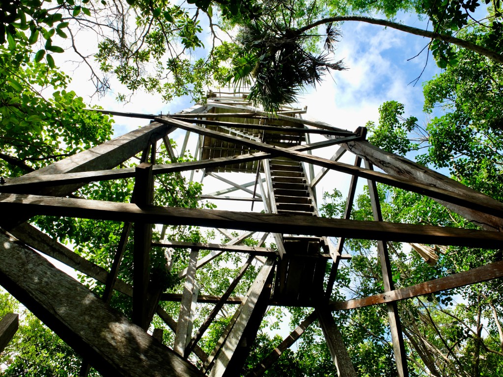 Halfway along the path, we discovered a high structure meant to observe more of the biosphere. Signs were posted that climbers ascended at their own risk. Despite my realization a few years back that I have a bit of vertigo when I climb, I was still excited to see more (Chandler was not). However, it only took a few steps up to realize that the wood was soft in some places and covered in spiderwebs. I figured it was just as likely that I would let go or break a step, so I quickly descended.