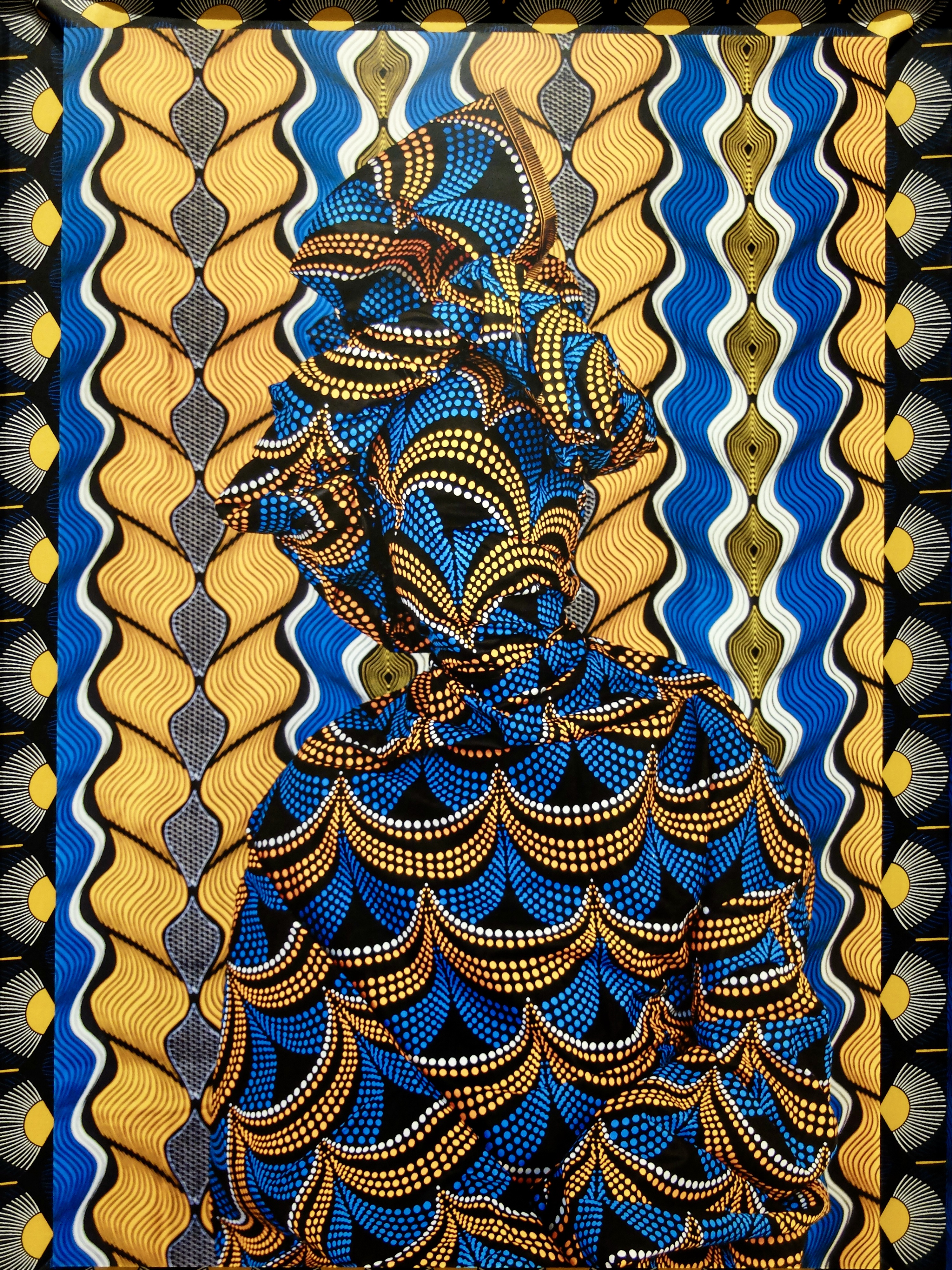 But my favorite pieces in the museum came from Alia Ali, a Yemeni-Bosnian-Us artist: Blue Pearls & Ochre Waves. She uses fabric to get viewers to think about the peoples, cultures, and histories that produced them. The photos below were made with what is often considered West African print, but is in fact often made in the Netherlands or China.