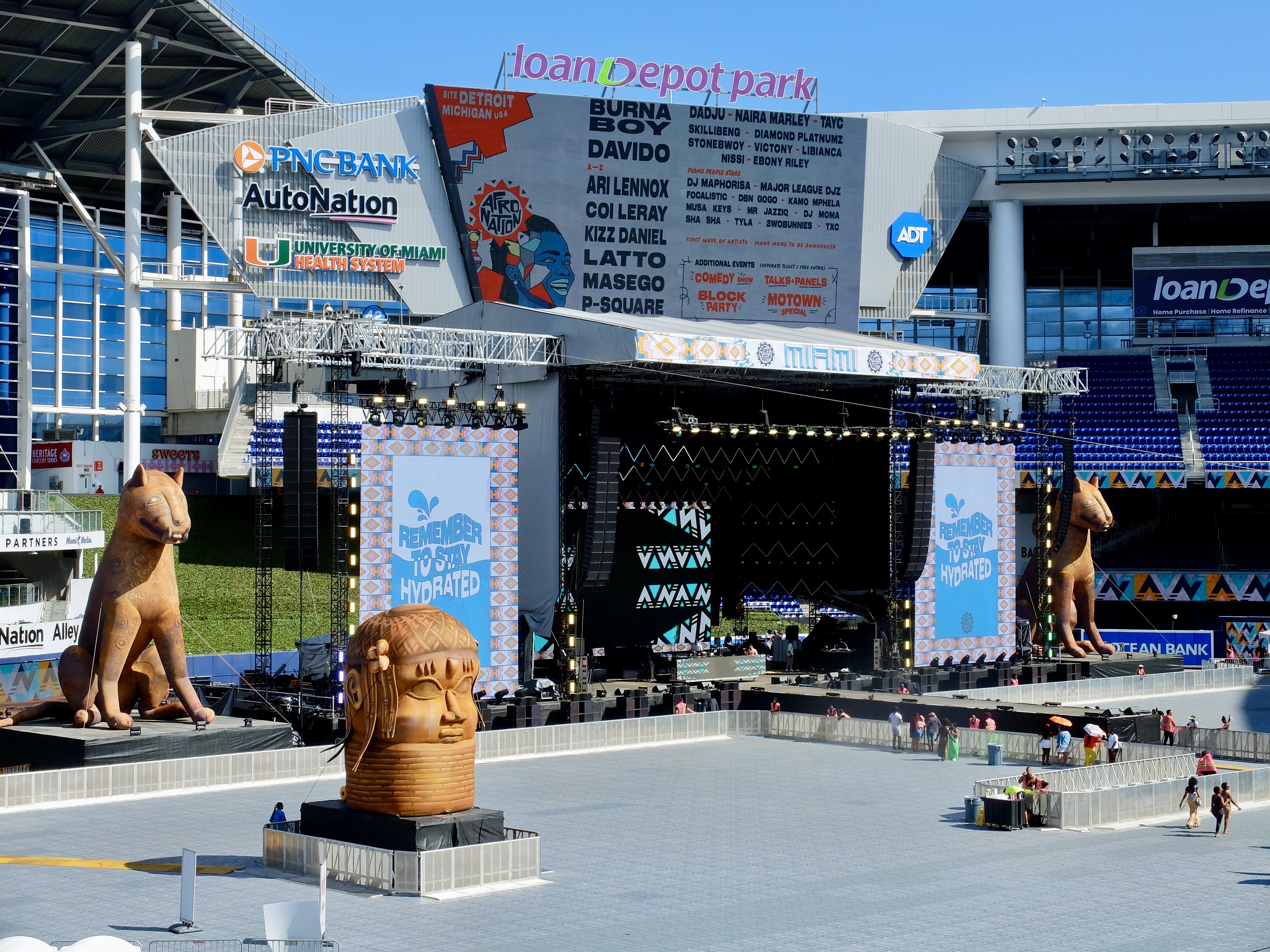 The festival was located at loanDepot park, home of the Miami Marlins. It was advertised as starting at 2pm and lasting until midnight. We knew the line up, but couldn’t find set times for each artist. We figured we should arrive sooner, rather than later, and after parking, made our way through the VIP entrance around 2:30pm. The Main Stage (inside the stadium) wasn’t open yet, but the outdoor Amapiano Stage (DJ/house music) was in full swing.