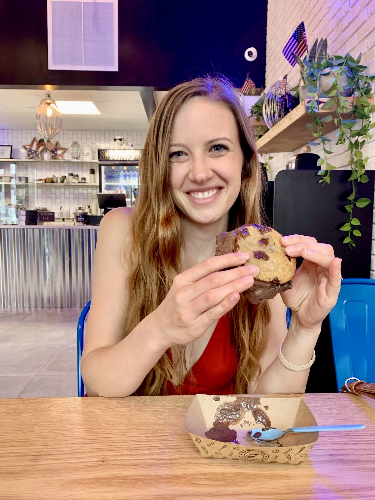 With homemade ice cream and fresh-baked cookies, their menu is nothing short of divine. I opted to mix and match my cookies and use dark chocolate ice cream to hold together a chocolate chip cookie and Mexican hot chocolate cookie. Because I’m a purist, I skipped the toppings, but I did opt for the hot press to help hold it together.