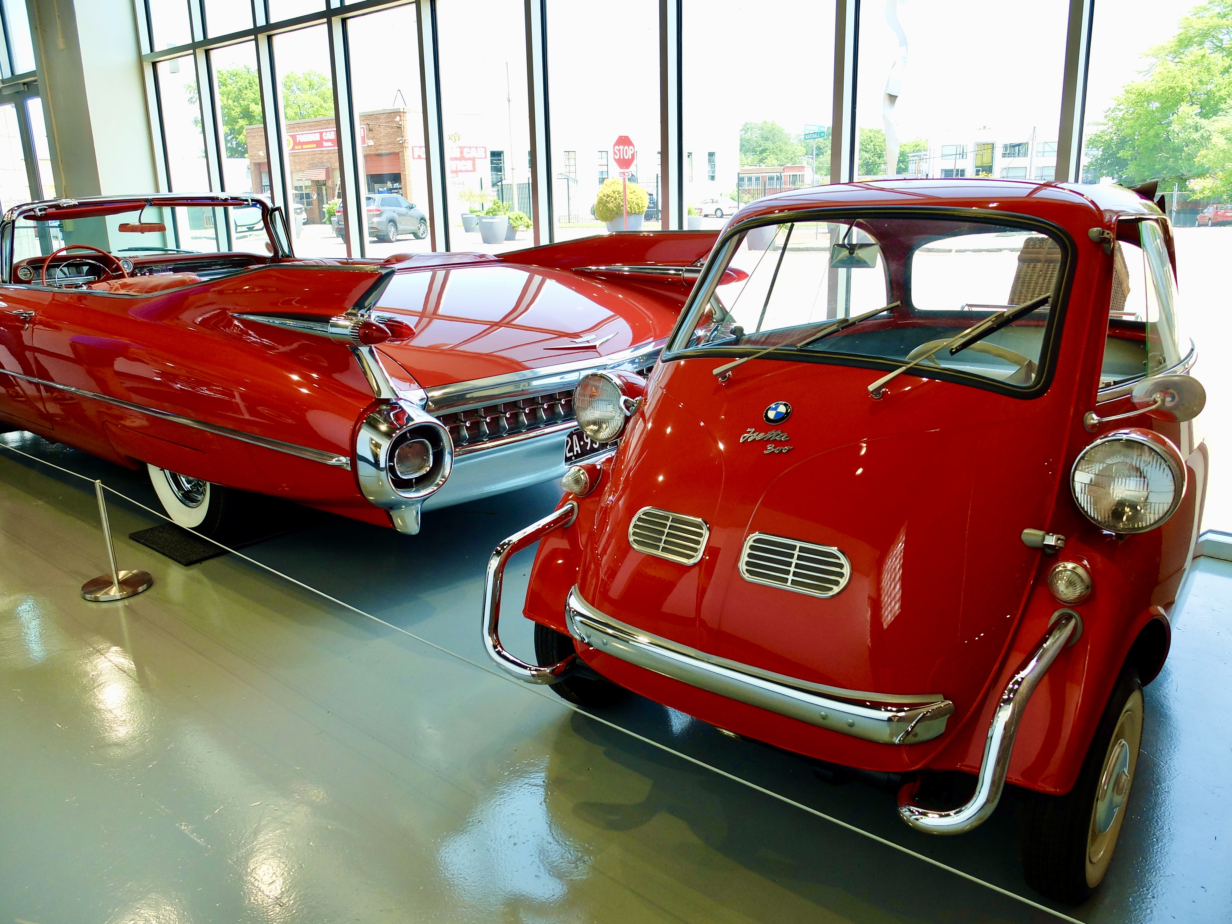 Next up was a comparison of cars in the US and Germany after WWII. On display was a 1959 Cadillac Coupe Deville (with plane jets for tail fins) and a late 50s BMW Isetta 300 (with a fridge for the front door). They were comical when comparing weight, length, and horsepower. Which made sense given the economic differences in each country in the 40s and 50s.