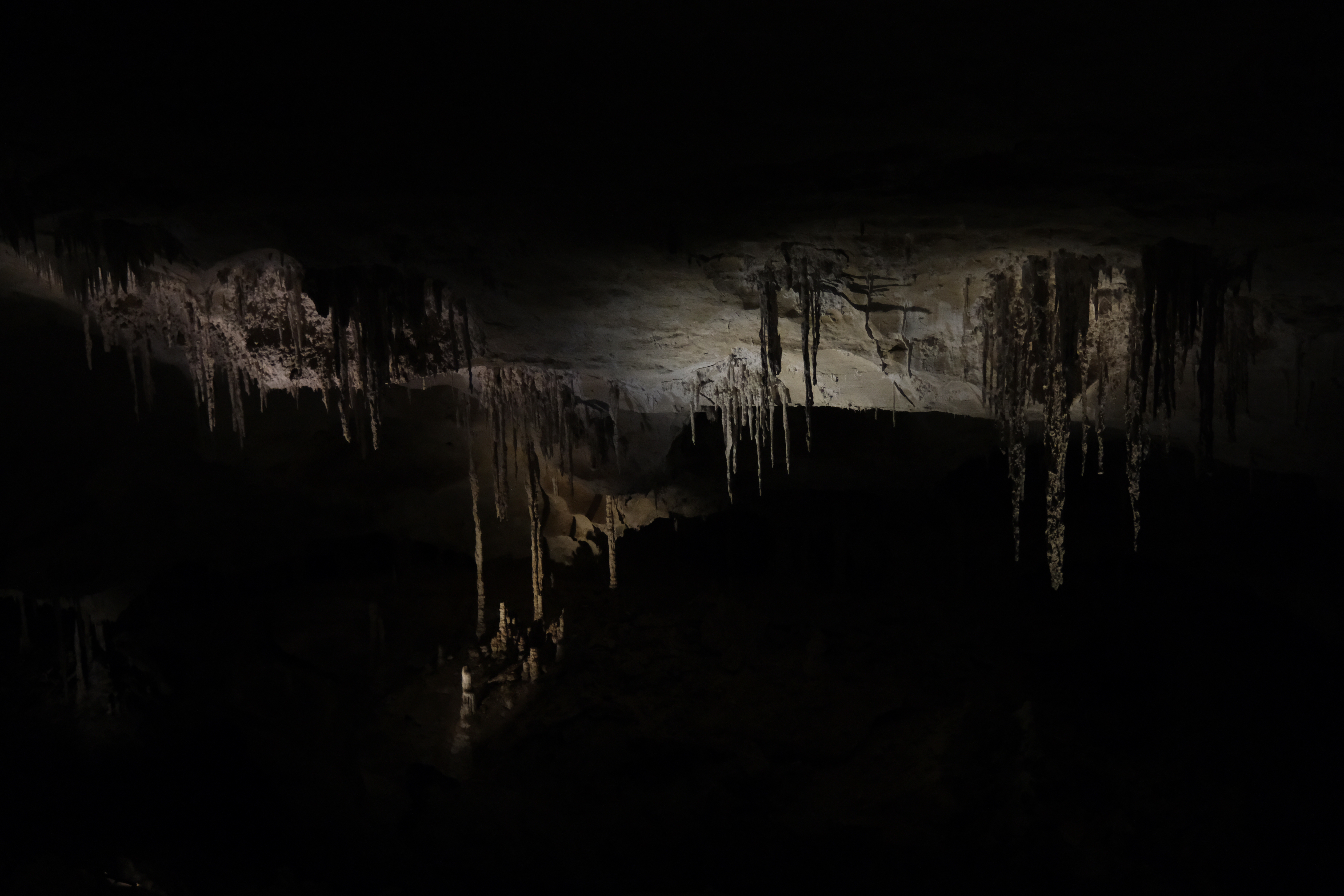 The decision was made for us when we arrived at the park and got in line with about 100 other people. We decided to hike down to experience the entrance of the trail as recommended since there was no way we were going to arrive first in the cave! It turned out that there’s a reason that direction of the route is recommended. The “steep” trail was incredibly manageable, but at 75 stories high it would have been brutal walking up. Plus, the rock formations were incredible. Below is one of the first photos I took just when the cave got completely dark.