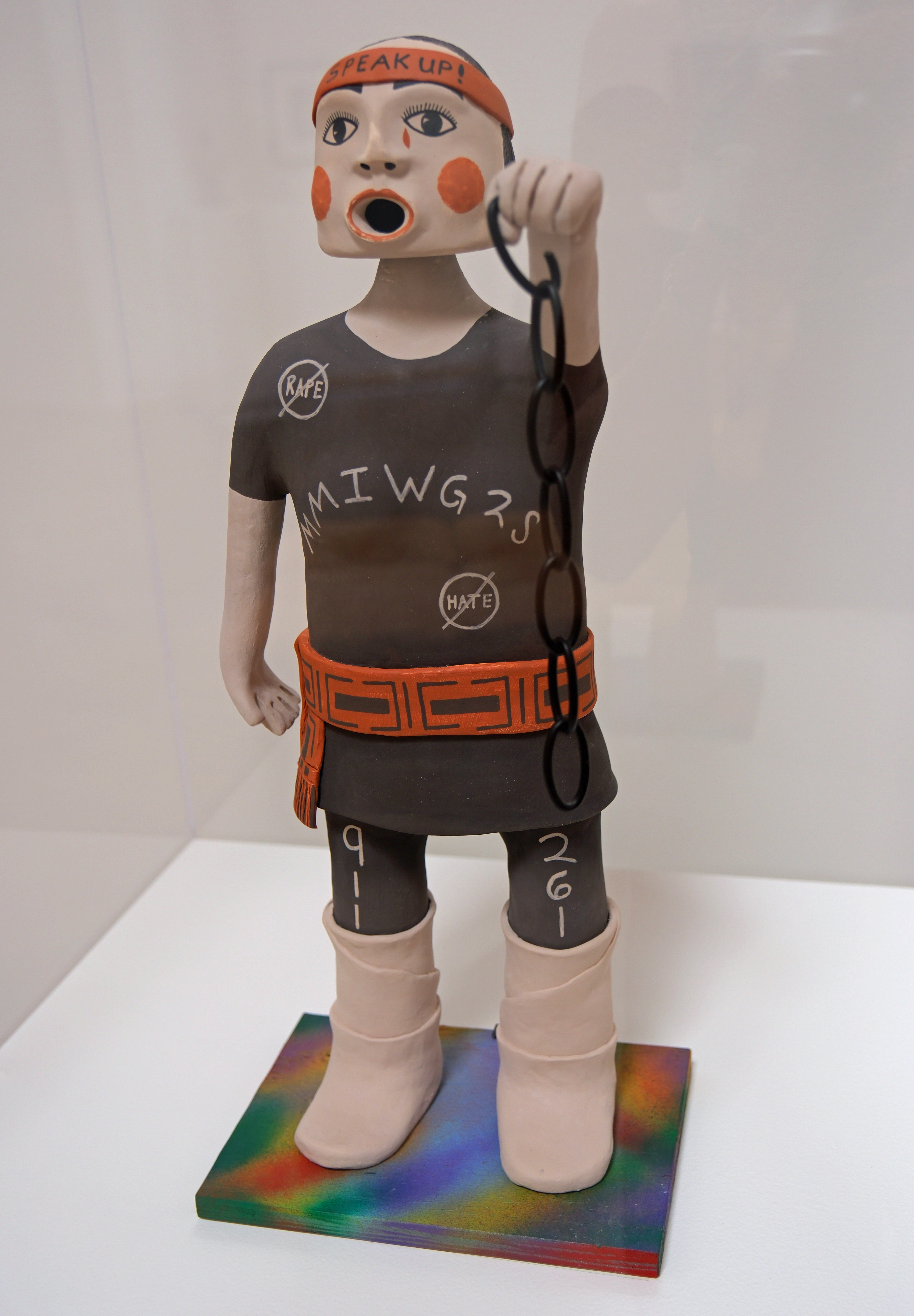 Below are two clay bobbleheads by Jonathan Loretto (Jemez/Cochiti). The first, Frybread Joe, is a humorous search for the best frybread; while the second, Rainbow, is about speaking out about missing Indigenous peoples.