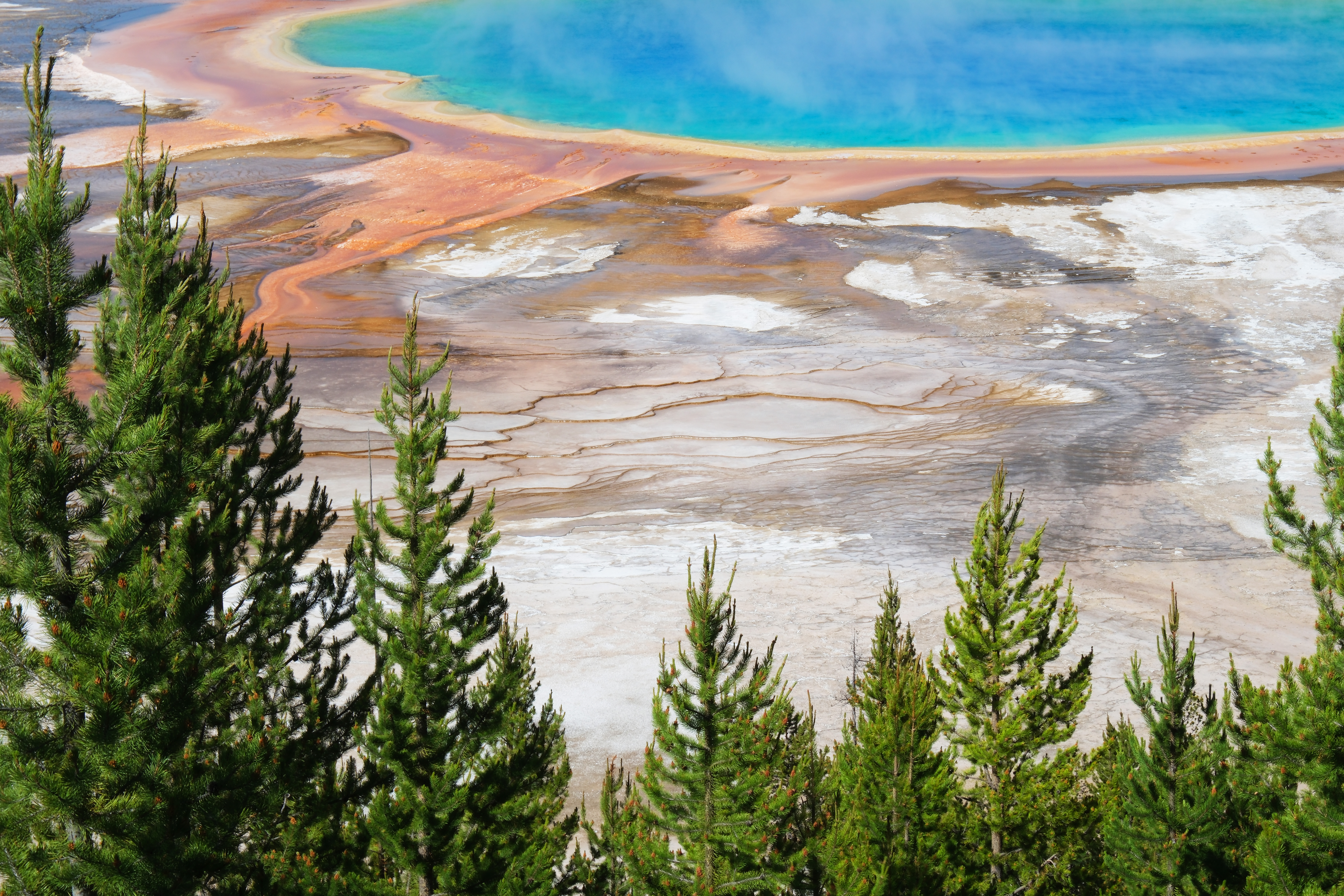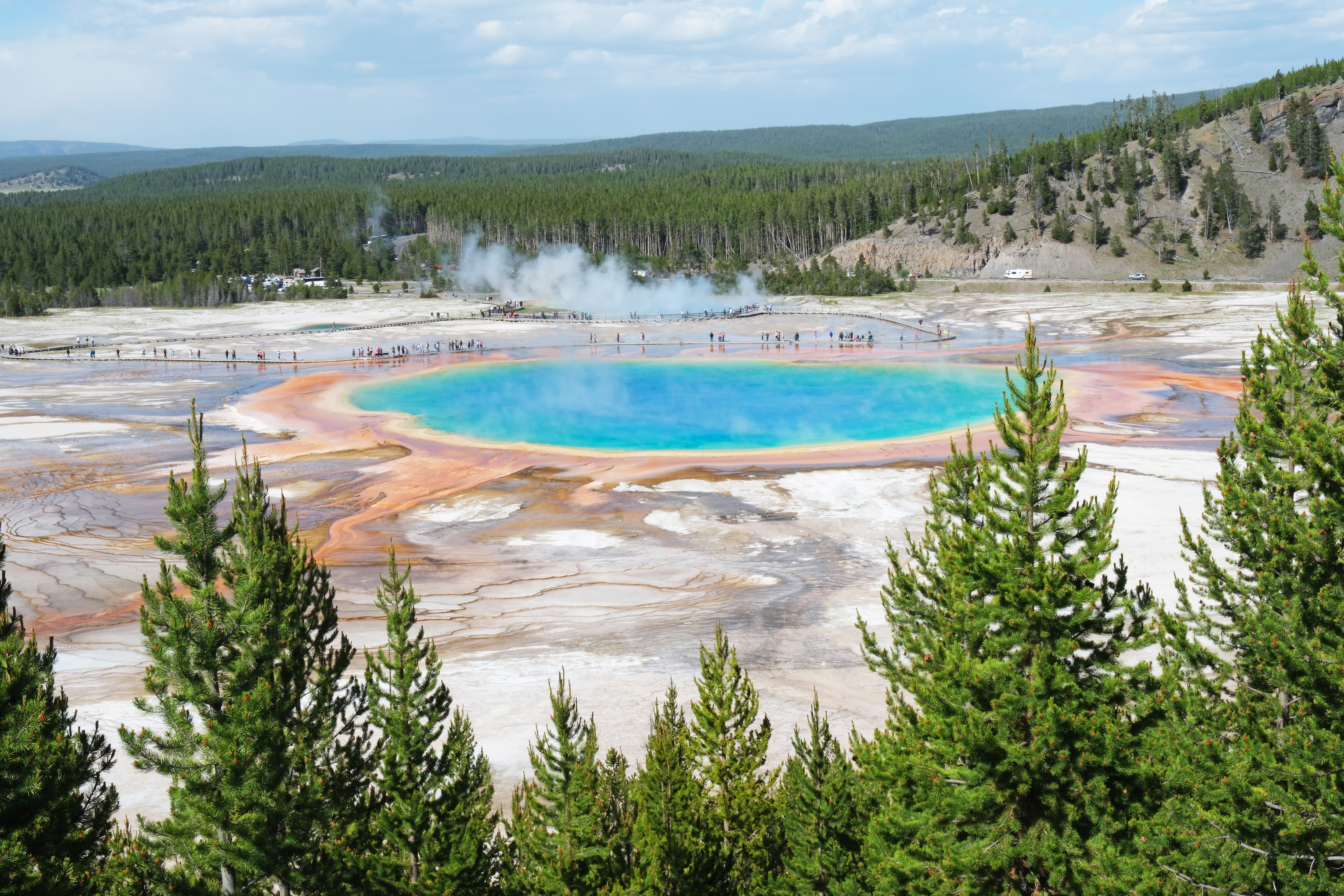 There were two major issues with this: Because we’d driven into the park from a long distance, it was well into the afternoon and parking at the Midway Geyser Basin is extremely limited. The queue to get in the parking lot was daunting. Additionally, it was incredibly windy that day and hot springs emit steam, which was whipping around, obscuring everyone’s vision.