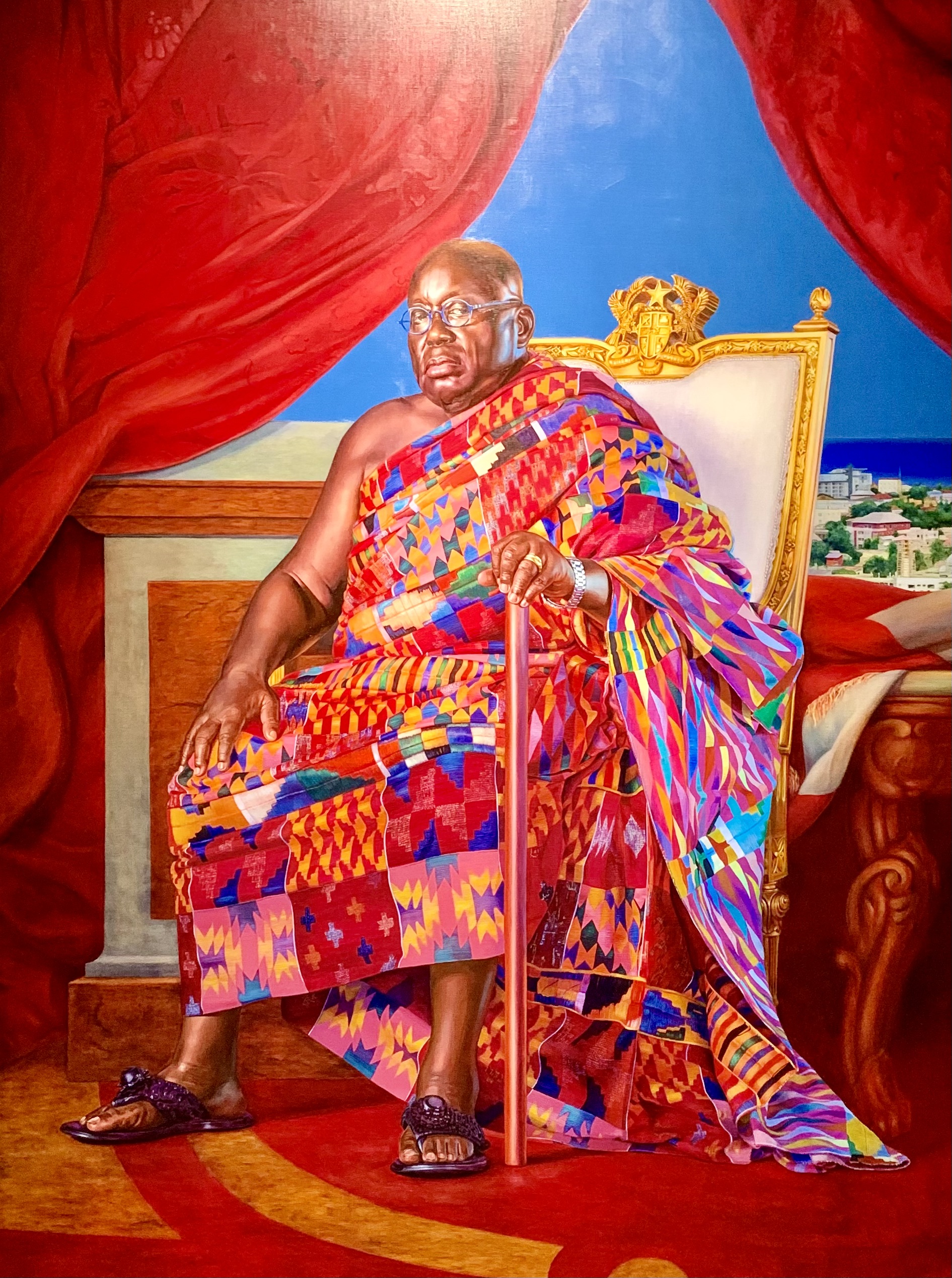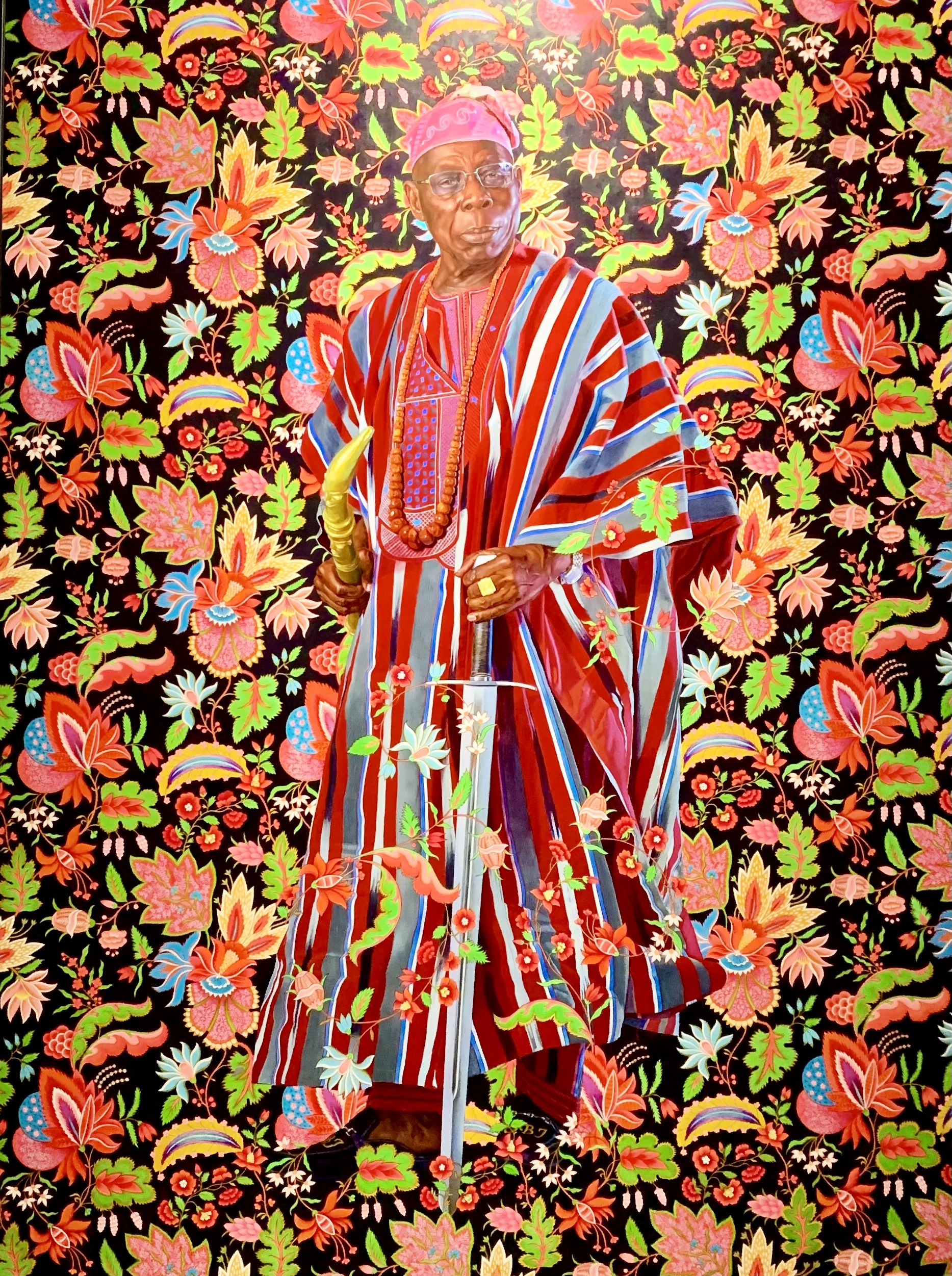In 2018, Wiley painted the now iconic portrait of President Barack Obama. Afterward, he set about painting leaders throughout Africa (regardless of whether or not he agreed with their politics). Some got more traditional backgrounds, others have the bright, bold flowers that Wiley is known for.