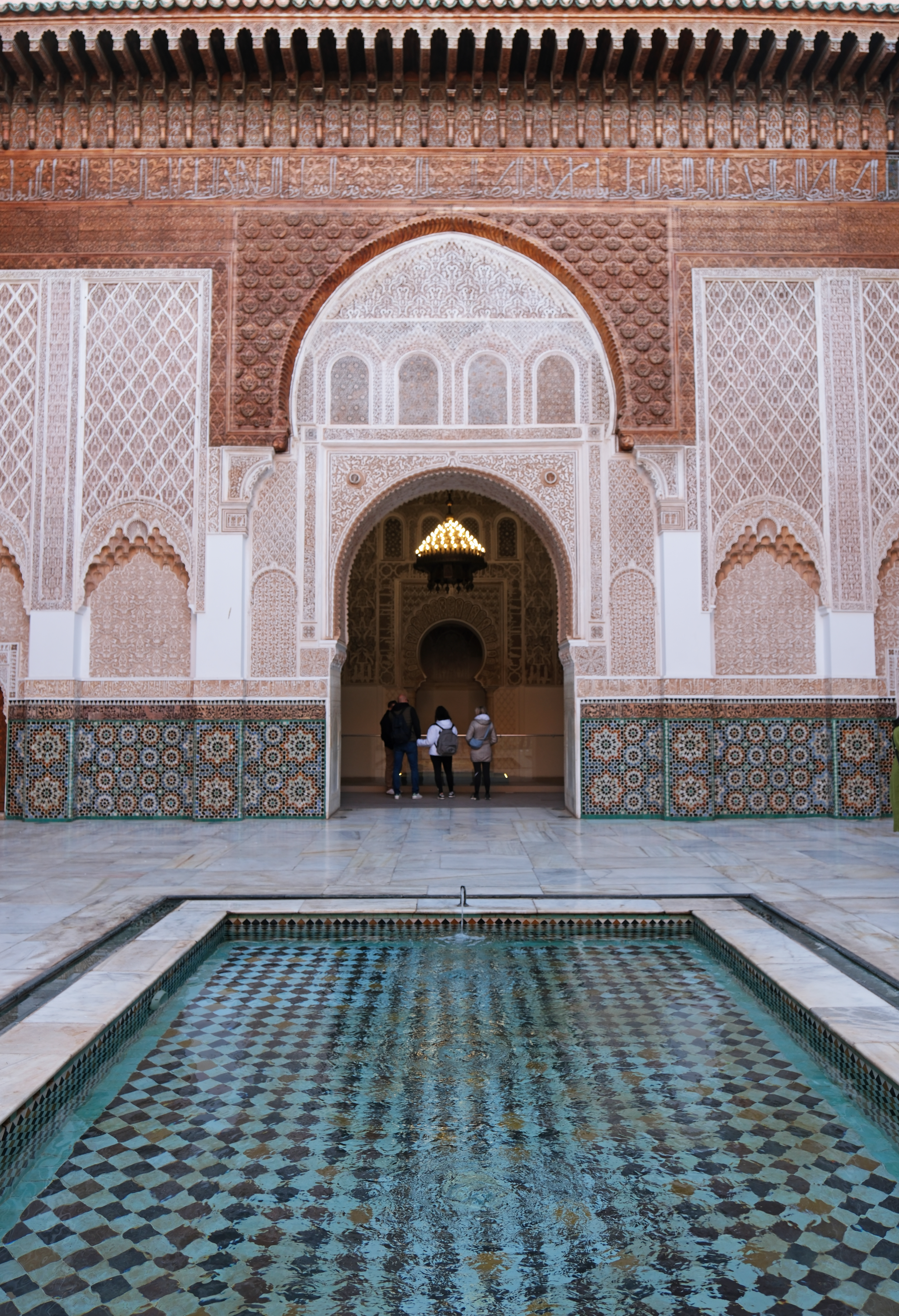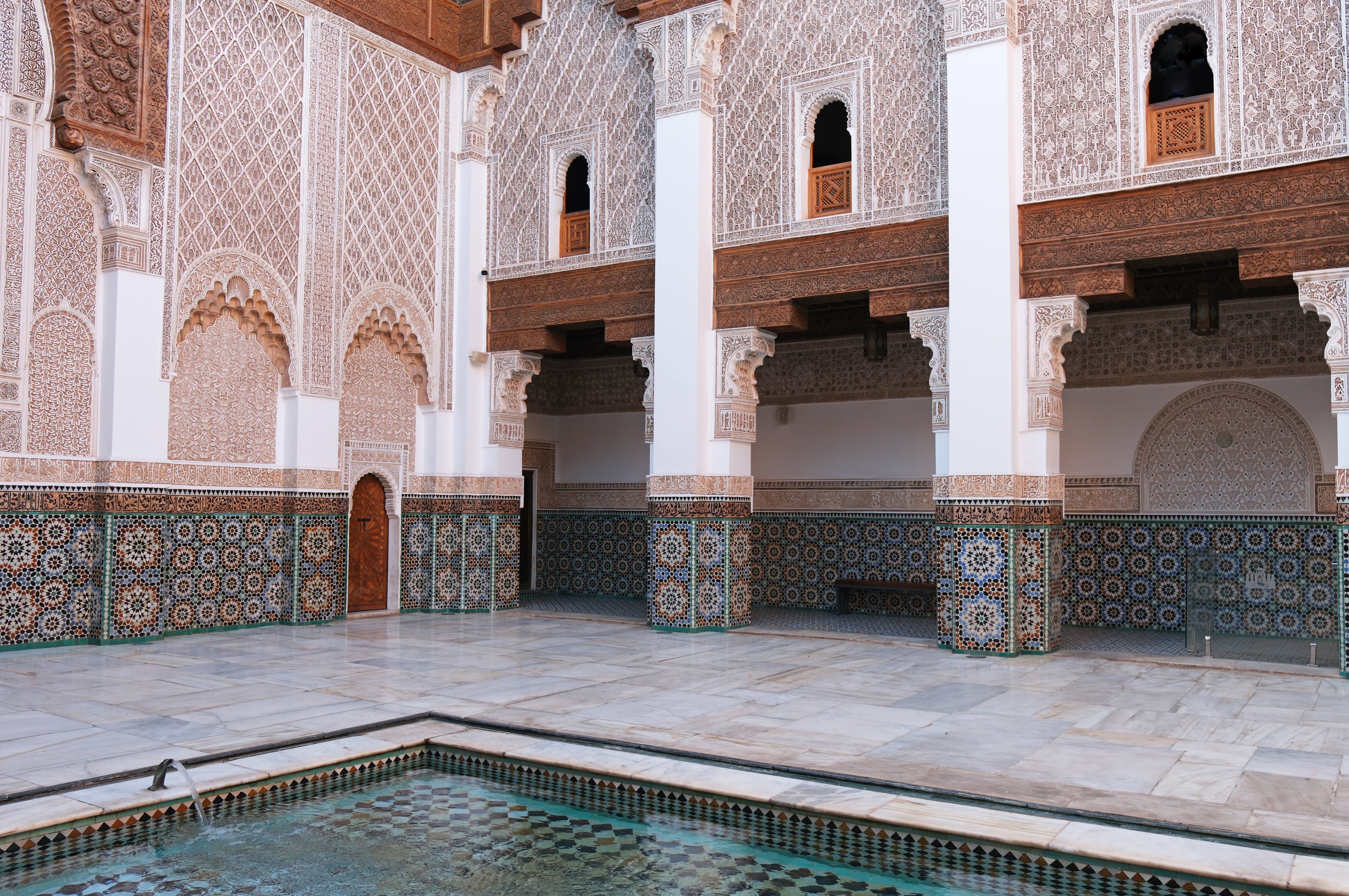The madrasa is renowned for its stunning Saadian architecture, featuring intricate zelige tilework, carved cedarwood, and stucco detailing that blend geometric and floral patterns with Quranic inscriptions. Its central courtyard is a masterpiece of symmetry and design.