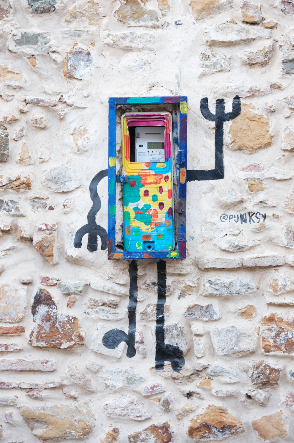 Next to the theater we found a super fun piece of street art created by the artist Punksy. He is known for transforming everyday urban elements, particularly electric meters, into vibrant pieces of art, adding splashes of color throughout the city.