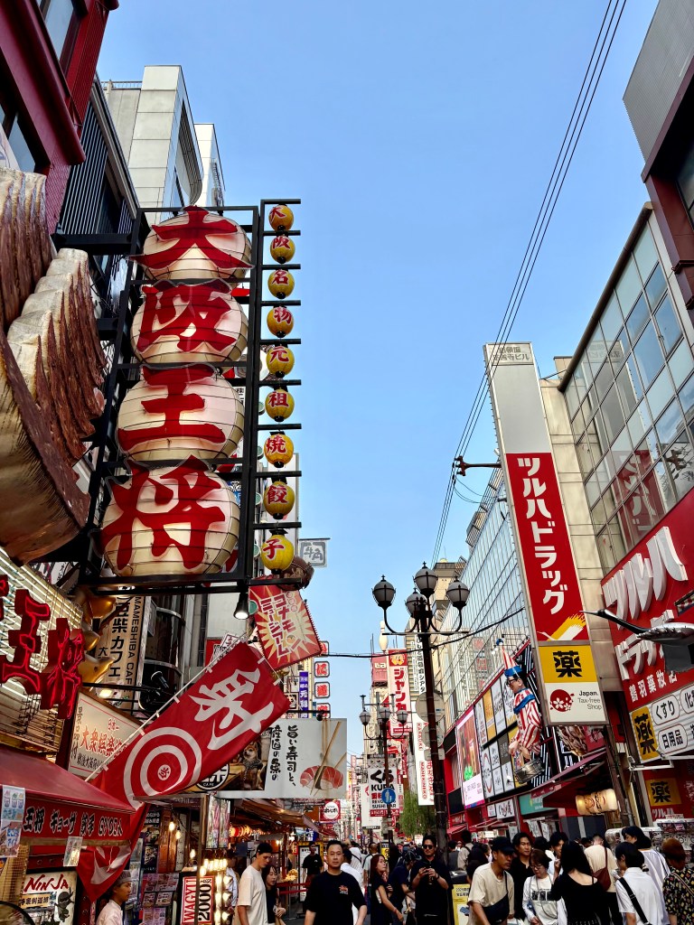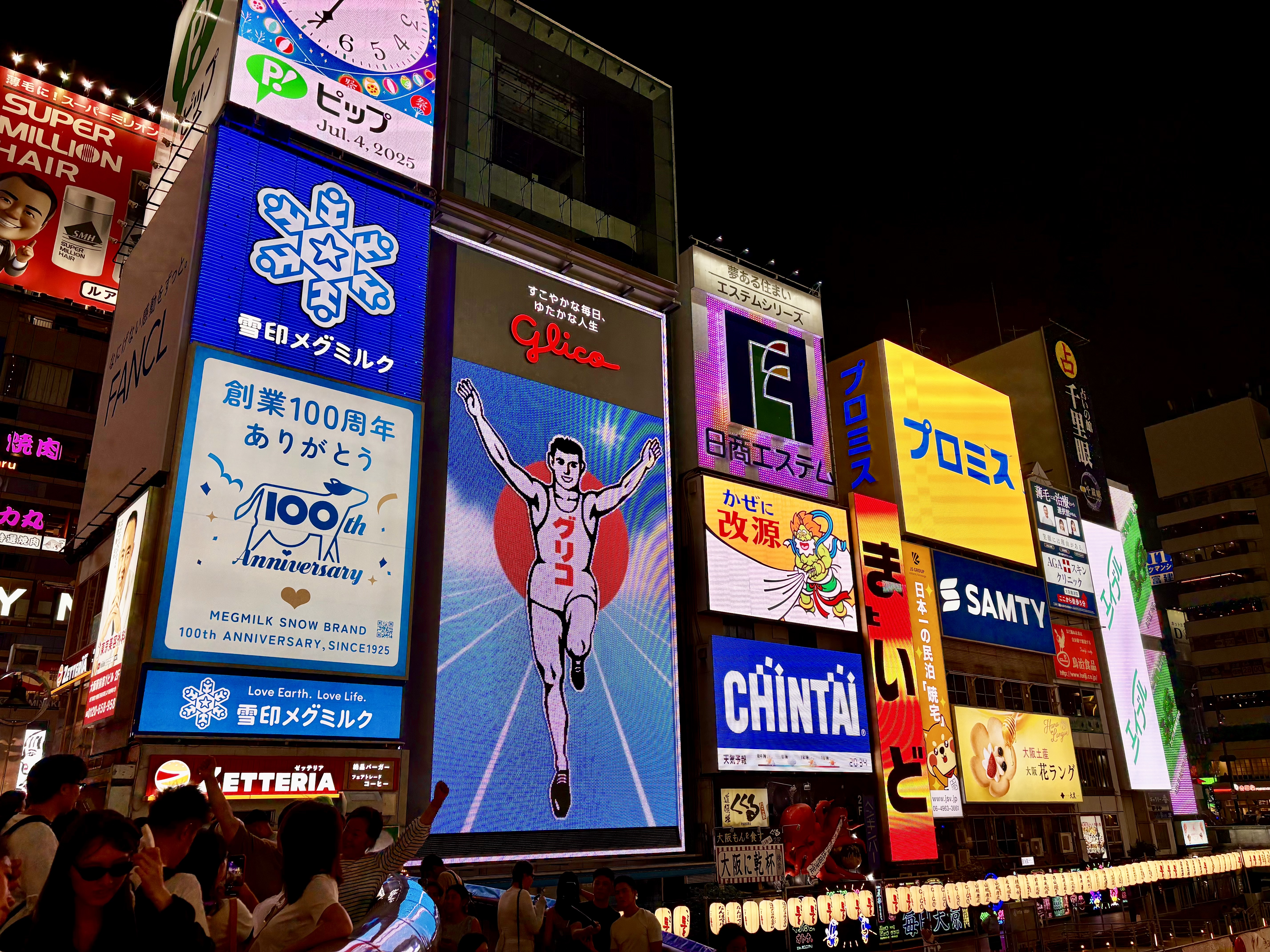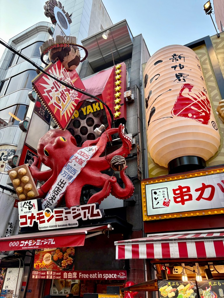 One of the things Osaka is famous for is takoyaki – octopus balls – and Dōtonbori leans all the way into it. Giant octopus signs hang all over the canal, tentacles curling out from buildings, cartoon versions blinking and waving from storefronts. Visually, I loved it. The octopus has always been my favorite sea creature, and the designs are playful and strange in the best way.